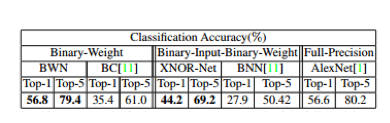 与ALexNet相比,BWN网络能够达到精度基本不变甚至略好,XNOR-Net由于对输入也做了二值化,性能稍降。