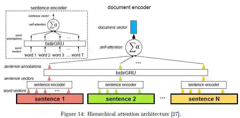 下图所示的体系结构提供了一个关于自注意力机制如何良好地在实践中运用的简单的例子。在这种体系结构中,自注意力机制发挥了两次作用:在单词级别和句子级别。这种方法有意义的原因有两个:首先,它符合文档的自然层次结构(单词-》句子-》文档)。其次,在计算文档的编码时,它允许模型首先确定每个句子中哪些单词是重要的,然后确定哪些句子是重要的。通过句子的注意力系数重新调整单词的注意力系数,该模型捕获了这样一个事实:当在给定的句子中找到时,给定的单词实例可能非常重要,但是当在另一个句子中找到时,同一单词的另一个实例可能不那么重要。