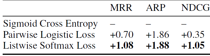 谷歌在两个关键任务场景中评估了 TF-Ranking: 对存储在谷歌驱动器中的文档进行Gmail搜索和推荐。在Gmail搜索场景中,使用TF-Ranking对匹配特定用户查询的五个结果进行排序。用户点击等指标被用作排名的相关标签。不同排序模型的结果如下矩阵所示。