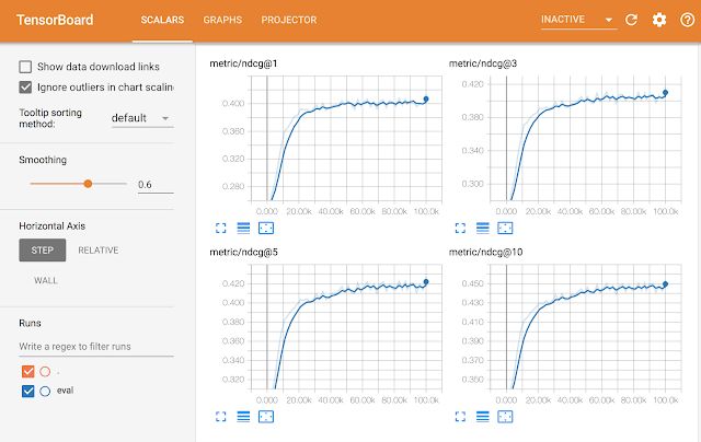 除了编程简单之外,TF-Ranking还集成了TensorFlow生态系统的其他部分。使用TF-Rankign开发的模型可以使用TensorBoard工具集进行可视化评估,如下图所示。