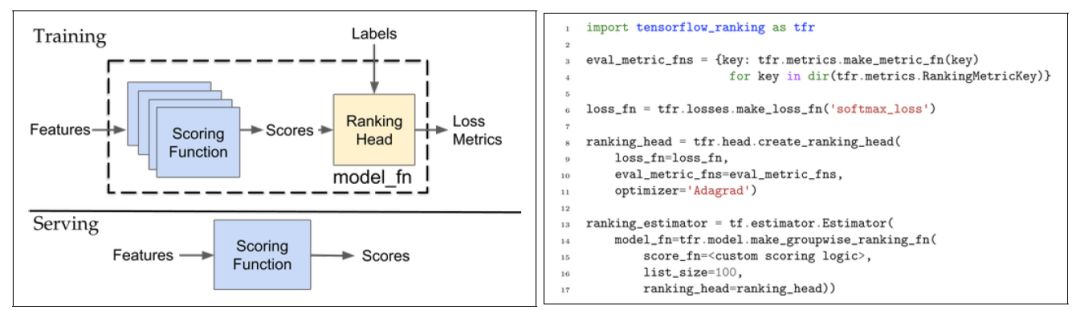 TF-Ranking的实现非常复杂,但使用起来也非常简单。该实现的核心组件是一个model_fn函数,它接受特征和标签作为输入,并根据模式(TRAIN、EVAL、PREDICT)返回损失、预测、度量指标和训练操作。使用TF-Ranking构建model_fn函数是基于两个基本组件的组合: 评分函数(scoring function)和排名头(ranking head)。