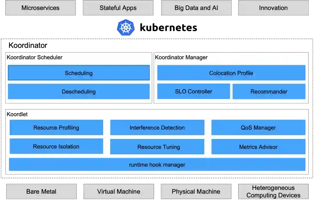 Koordinator: 取自 coordinator,K for Kubernetes,发音相同。语意上契合项目要解决的问题,即协调编排 kubernetes 集群中不同类型的工作负载,使得他们以最优的布局、最佳的姿态在一个集群、一个节点上运行。
