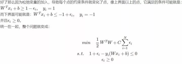 你发现目标函数里面多了一点东西,而加上这个是合理的,我们在优化的同时,也使得总的松弛变量之和最小。常数C决定了松弛变量之和的影响程度,如果越大,影响越严重,那么在优化的时候会更多的注重所有点到分界面的距离,优先保证这个和小。好了将问题写在一起吧: