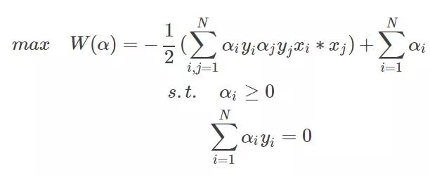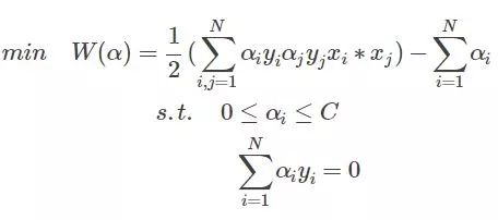 那么求解最最开始的函数的最小值等价到这一步以后就是求解W的最大值了,因为使用了拉格朗日乘子法后,原问题就变为其对偶问题了,最小变成了最大,至于为什么,等到详细研究过对偶问题再来解释吧。不了解的,只需要知道求W的极值即可。整理一下,经过这么一圈的转化,最终的问题为:
