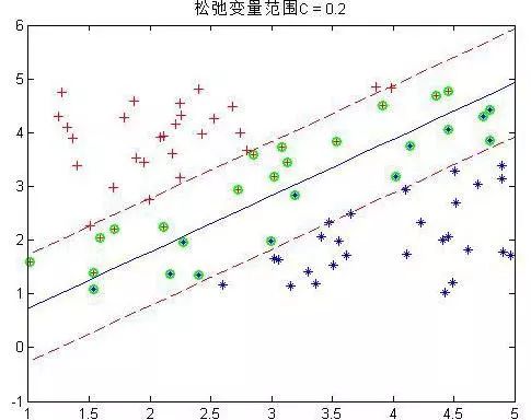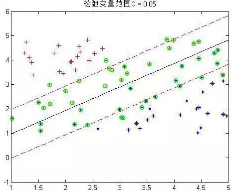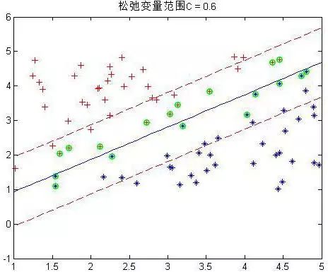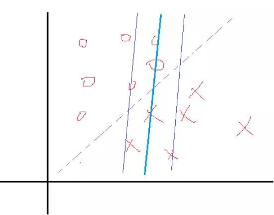 正负两类的最远点没有明显的分解面,搞不好正类的最远点反而会跑到负类里面去了,负类最远点跑到正类里面去了,要是这样的话,你的分界面都找不到,因为你不可能找到将它们完全分开的分界面,那么这些点在实际情况是有的,就是一些离群点或者噪声点,因为这一些点导致整个系统用不了。当然如果不做任何处理确实用不了,但是我们处理一下就可以用了。SVM考虑到这种情况,所以在上下分界面上加入松弛变量e,认为如果正类中有点到上界面的距离小于e,那么认为他是正常的点,哪怕它在上界面稍微偏下一点的位置,同理下界面。还是以上面的情况,我们目测下的是理想的分解面应该是下面这种情况: