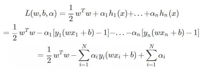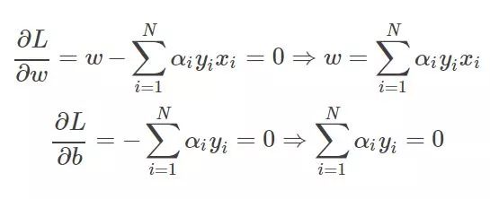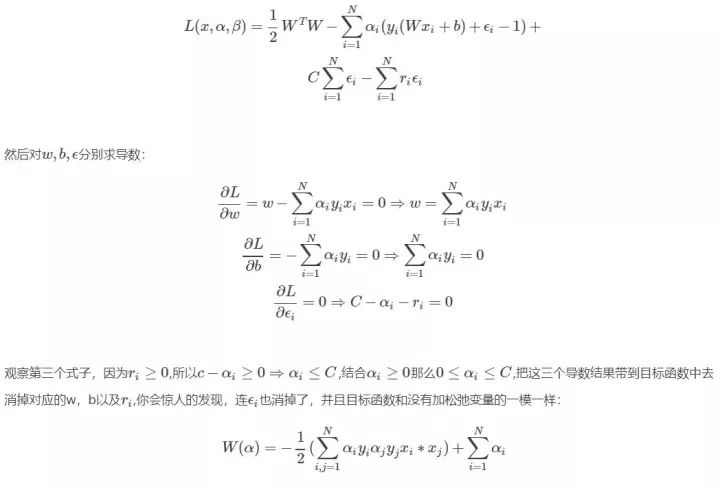 好了得到上面的两个公式,再带回L中把去w和b消掉,你又可能发现,w确实可以消,因为有等式关系,那b怎么办?上述对b求导的结果竟然不含有b,上天在开玩笑吗?其实没有,虽然没有b,但是有那个求和为0呀,带进去你会惊人的发现,b还真的可以消掉,就是因为了那个等式。简单带下: