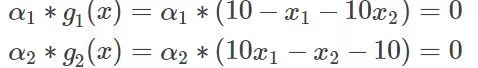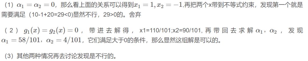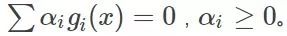 那么如果不管呢?因为g1(x)与g2(x)已经在边缘了,所以取它的梯度是一定会让目标函数变好的。综合来看,这个时候我们就不选g3。那么再往下走,假设到了自变量优化到了x3,这个时候发现g2(x)与g3(x)等于0,也就是走到边了,而g1(x)小于0,可变化的空间绰绰有余,那么这个时候举要取g2(x)与g3(x)的梯度方向作为变化的方向,而不用管g1(x)。那么一直这样走呀走,最终找到最优解。可以看到的是,上述如果g1(x)、g2(x)=0的话,我们是需要优化它的,又因为他们本身的条件是小于0的,所以最终的公式推导上表明,是要乘以一个正系数作为他们梯度增长的倍数,而那些不需要管的g(x)为了统一表示,这个时候可以将这个系数设置为0,那么这一项在这一次的优化中就没有了。那么把这两种综合起来就可以表示为