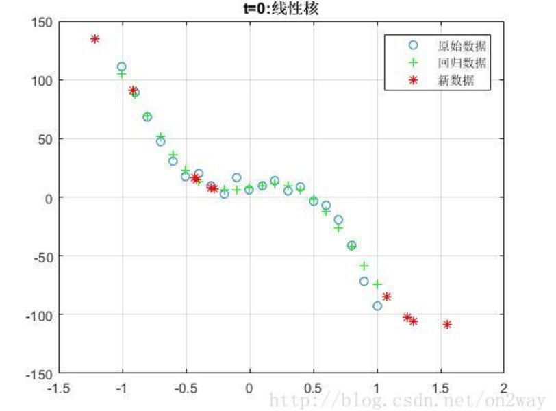 因为我们的数据是由三次函数模拟生成的,所以可以看到,在这种情况下使用线性核t=0时候效果更好,然而实际情况下一般我们也不知道数据的分布函数,所以在选择核函数的时候还是需要多实验,找到最适合自己数据的核函数。