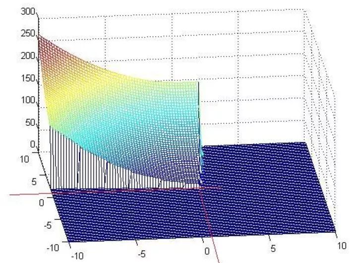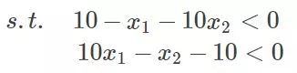 x1=110/101=1.08;x2=90/101=0.89,那么它得到结果对不对呢?这里因为函数简单,可以在matlab下画出来,同时约束条件也可以画出来,那么原问题以及它的约束面画出来就如下所示: