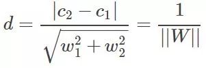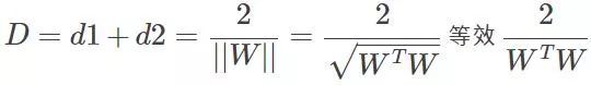 好了再看看D=d1+d2怎么求吧,假设分界面W'X+b=0,再假设X是两维的,那么分界面再细写出来就是:W1'X1+W2'X2+b=0。上分界线:W1'X1+W2'X2+b=1,这是什么,两条一次函数(y=kx+b)的曲线是不是,那么初中就学过两直线的距离吧,