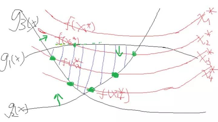 这个时候,我们发现在x2的基础上再寻找一组更优解要靠谁呢?当然是要靠约束条件g1(x)与g2(x),因为他们等于0了,很极限呀,一不小心,走错了就不满足它们两了,这个时候我们会选择g1(x)与g2(x)的梯度方向往下走,这样才能最大程度的拜托g1(x)与g2(x)=0的命运,使得他们满足小于0的约束条件对不对。至于这个时候需不需要管g3(x)呢?正常来说管不管都可以,如果管了,也取g3在x2处的梯度的话,因为g3已经满足了小于0的条件,这个时候在取在x2处的梯度,你能保证它是往好的变了还是往差的变了?答案是都有可能。运气好,往好的变了,可以更快得到结果,运气不好,往差的变了,反而适得其反。