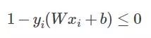 某一次迭代后,分类面为粗蓝线所示,上下距离为1的分界面如细蓝线所示,而理想的分界面如紫虚线所示。那么我们想想,要想把粗蓝线变化到紫虚线,在这一次是哪些个点在起作用?很显然是界于细蓝线边上以及它们之间的所有样本点在起作用吧,而对于那些在细蓝线之外的点,比如正类的四个圈和反类的三个叉,它们在这一次的分类中就已经分对了,那还考虑它们干什么?所以这一次就不用考虑这些分对了的点。那么我们用数学公式可以看到,对于在这一次就分对了的点,它们满足什么关系,显然