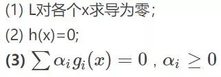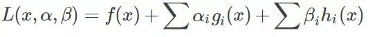 其中g是不等式约束,h是等式约束(像上面那个只有不等式约束,也可能有等式约束)。那么KKT条件就是函数的最优值必定满足下面条件: