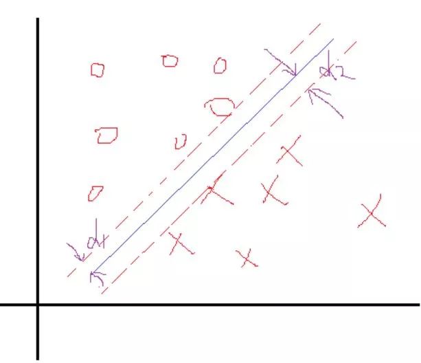 这里我们把问题反过来看,假设我们知道了结果,就是上面这样的分类线对应的权值W和b。那么我们会看到,在这两个类里面,是不是总能找到离这个线最近的点,向下面这样: