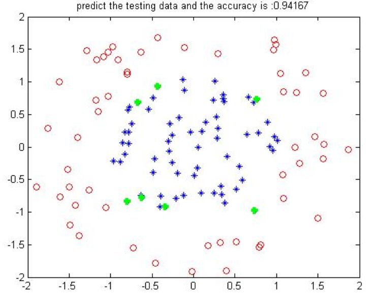 title(['predict the testing data and the accuracy is :',num2str(accuracy)]);