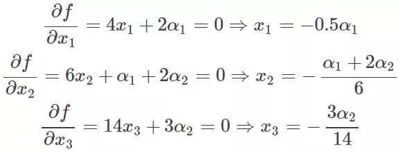 这里可以看到与相乘的部分都为0,所以的取值为全体实数。现在这个优化目标函数就没有约束条件了吧,既然如此,求法就简单了,分别对x求导等于0,如下: