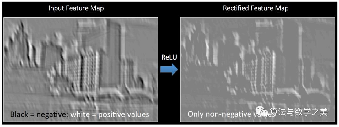 从图8可以很清楚地理解 ReLU 操作。它展示了将 ReLU 作用于某个特征映射得到的结果。这里的输出特征映射也被称为“修正”特征映射。