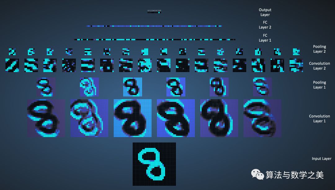 我们在下图中可以看到神经网络对于输入数字“8”的具体操作细节。请注意,图18中并未单独显示ReLU操作。