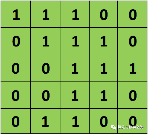 正如前文所说,每个图像可以被看做像素值矩阵。考虑一个像素值仅为0和1的5 × 5大小的图像(注意,对于灰度图像,像素值范围从0到255,下面的绿色矩阵是像素值仅为0和1的特殊情况):