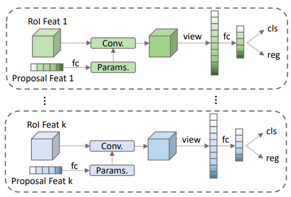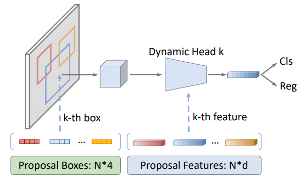 这组proposal features与proposal boxes提取出来的RoI feature做一对一的交互,从而使得RoI feature的特征更有利于定位和分类物体。