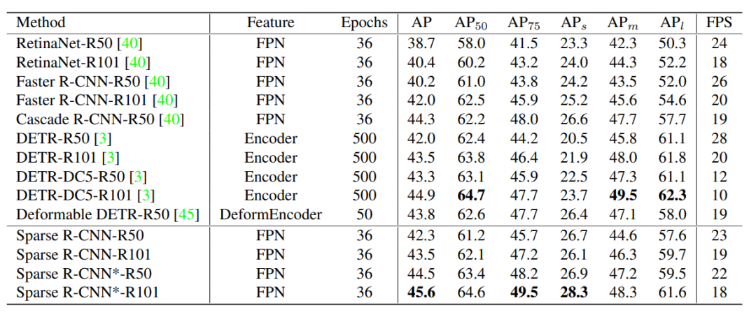同时,我们也列出了同样不需要NMS后处理的DETR和Deformable DETR的性能。Sparse R-CNN在检测精度,推理时间和训练收敛速度都展现了相当有竞争力的性能。
