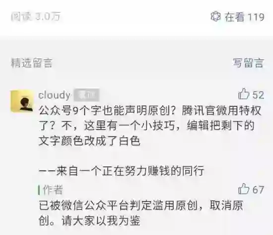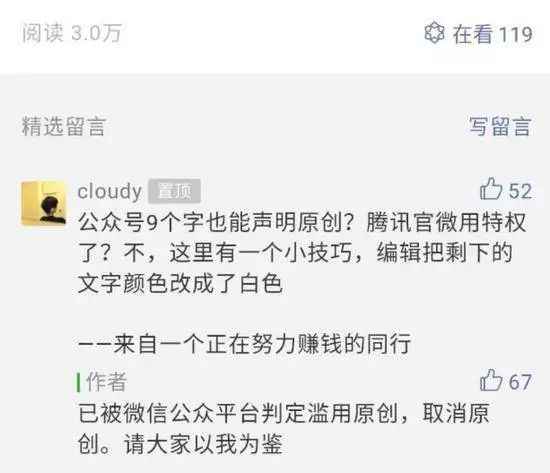“腾讯”官方公号昨日发布了一篇叫《微信钱包-零钱没有余额怎么办》的文章,文章页面显示仅有“那就努力工作赚钱吧”9个字,且被标注为“原创”文章。这一做法被网友质疑道:“公众号9个字也能声明原创?腾讯官微用特权了?不,这里有一个小技巧,编辑把剩下的文字颜色改成了白色。”被用户投诉后,微信还取消了这篇文章的原创标识......