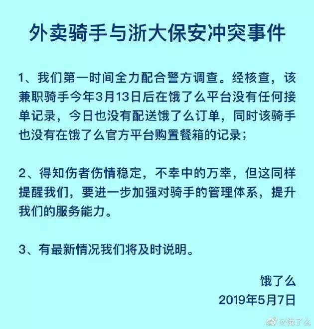 针对今日媒体报道的外卖骑手与浙大保安冲突事件,饿了么回应了: