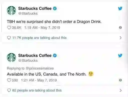 这个场景呈现在了新一季的权游中。在5日播出的第8季第4集《最后的史塔克》剧情中,龙母的桌前赫然出现了一个星巴克咖啡杯,被人误以为是星巴克的植入。该剧的执行制片人伯尼·考菲尔德(Bernie Caulfield)在接受WNYC电台采访时回应称,乱入的星巴克咖啡杯是一个穿帮错误。“我们很抱歉!”