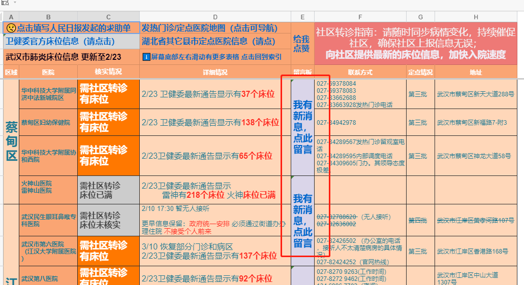 盒饭君至今都收藏着一份,在新冠疫情期间由志愿者组织bridge床位组整理的《武汉市定点医院床位医疗信息合集》的在线文档。