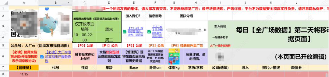 代号、性别、年龄、身高、学历、公司、收入、照片、颜值分、自我介绍、期望对象、联系方式等,为了互动和数据不被篡改,创建者将表格划成两个部分,上述内容是固定部分,后边增加留言评论区域。