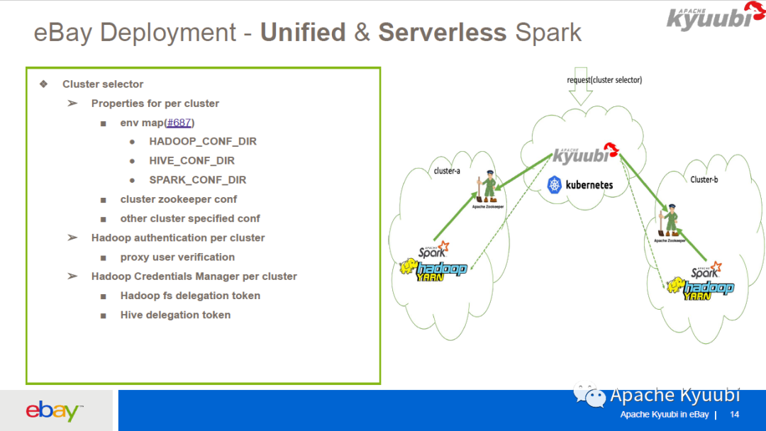 这是我们大概的一个部署,对于多集群我们引入了 Cluster Selector 的概念,为每个集群都配了一个 Kubernetes ConfigMap 文件,在这个文件里面有这个集群所独有的一些配置,比如这个集群的 ZooKeeper 的配置,集群的环境变量,会在启动 Kyuubi Engine 的时候注入到启动的进程里面。