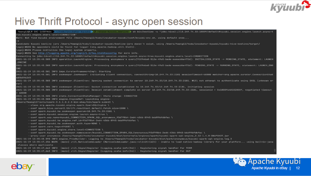 下面是一个效果,我们在建立 Kyuubi 连接的时候可以实时知道spark-submit的过程中到底发生了什么。比如说用户将 spark.yarn.queue 设置错了,或者说由于资源问题一直在等待,都可以清楚的知道这中间发生了什么,不需要找平台维护人员去看日志,这样既让用户感到极为友好,也减少了平台维护人员的 efforts。