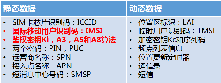 SIM卡里面的数据分为两类:静态数据和动态数据。静态数据一种是生产时永久写入卡里的,另一种是运营商发卡时写入的,一般不会变化。动态数据一种是根据网络状况动态更新的,另一种是用户存入的通讯录和短信等数据。