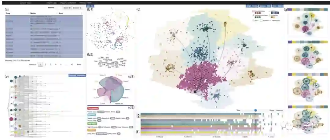 (图:D-Map系统界面,包括(a)源微博列表图、(b)源微博分布视图、(c)D-Map社交互动图、(d)社区雷达视图、(e)分层视图、(f)时间轴视图、(g)微型多视图)