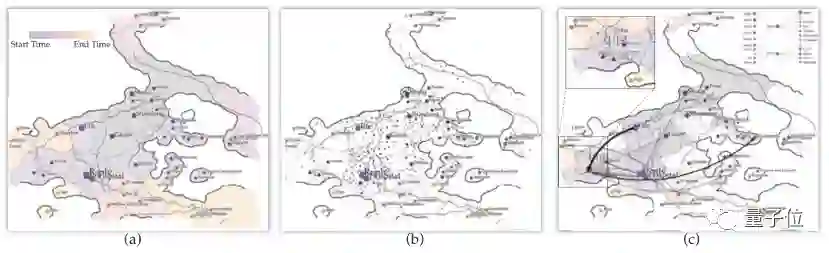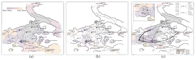 (图:在由非结构化社交媒体消息构建的E-Map中,(a)城市由从事件中提取到的关键字表示,颜色变化梯度表示事件的时间演化;(b)城市周围的城镇是由特定关键词的信息塑造的,Rivers代表了社交媒体用户的转载行为(例如转发)。地图上的用户轨迹和联系编码了用户讨论不同主题的行为(黑色曲线)和信息扩散方向(灰色直线);(c)E-Map还支持多层次的时空探索。)