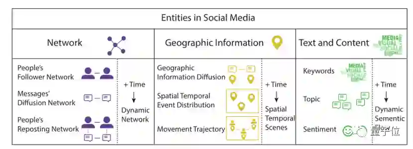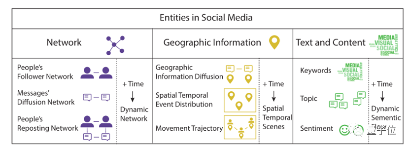 (图:社交媒体中的实体包括三个类别,每个类别又有三个子类别。作为网络实体,用户的社交网络包括关注者网络和转发网络,信息的扩散过程则记录在扩散网络中。对于地理信息,分析人员需要确定信息的转发位置,以便分析时空信息扩散、检测事件分布和分析人的轨迹。文本分析中,关键词、主题和情感则是社交媒体信息的重要特征。)