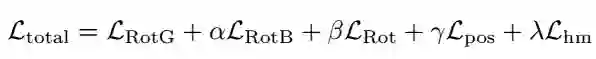 分别表示全局选择、每个骨头的旋转、最终的旋转、位置和交叉热力图损失。