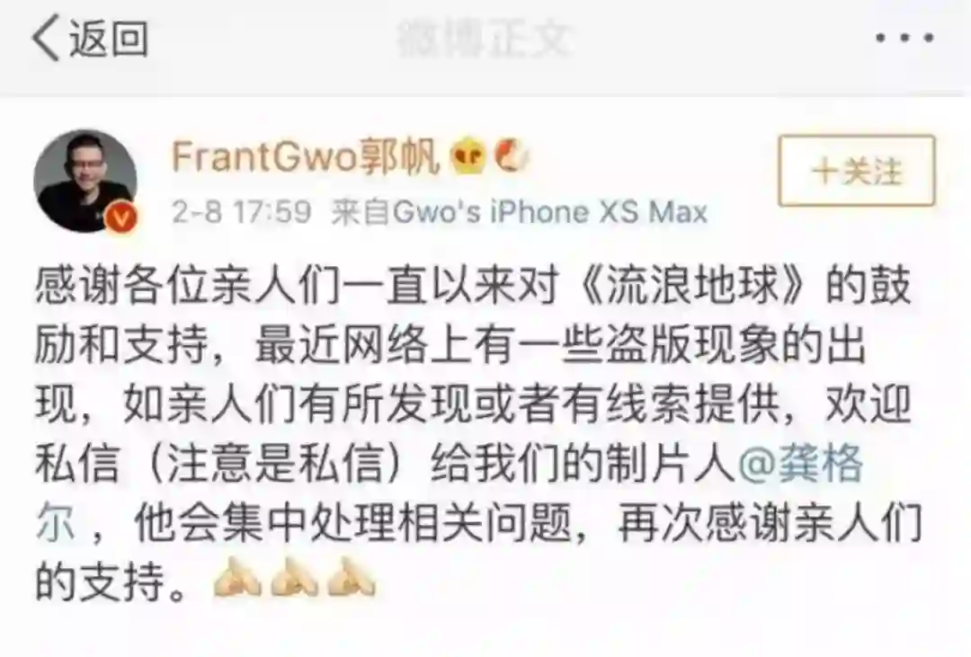 龚格尔表示,为防止盗版,《流浪地球》从源头上严格把控,在制作端更是层层加密,减少一切非必要素材接触。在上映期间,安排了三个防盗版团队全天候监控,并且已经在微博开通了举报盗版的直通渠道。但这一切举措依然难以阻止盗版。