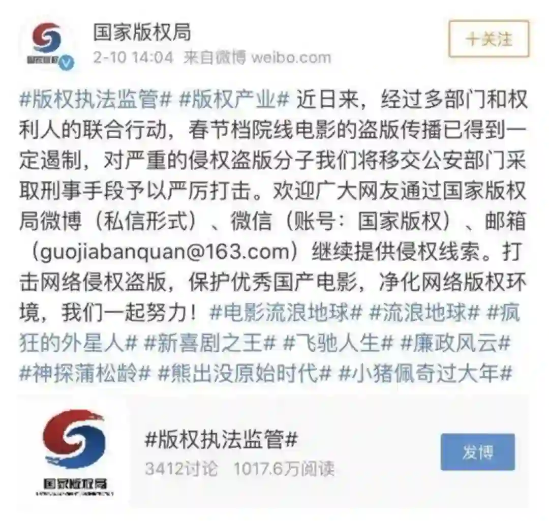 截止发稿前,据国家版权局几个小时前发布的官方微博表示,“近日来,经过多部门和权利人的联合行动,春节档院线电影的盗版传播已得到一定遏制,对严重的侵权盗版分子国家版权局将移交公安部门采取刑事手段予以严厉打击。”突破600亿大关向全球最大票仓狂奔的路上,国产电影的未来会变得更好吗?这不仅仅是影视公司、院线、观众某一方的抉择。(本文仅代表作者观点)
