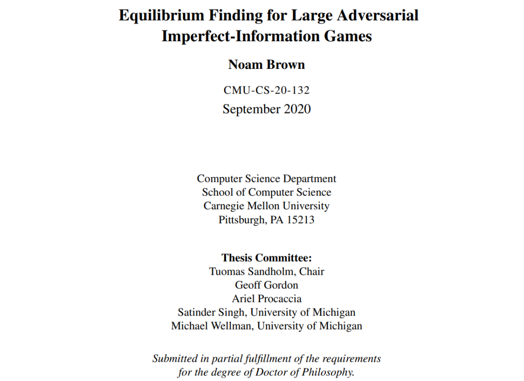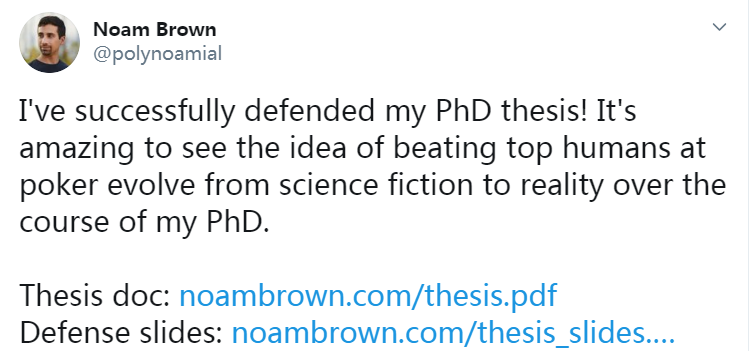 昨日,Noam Brown在推特上宣布答辩完成了卡耐基梅隆大学(CMU)的