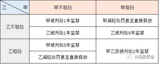 警察告诉每个人:如果两人都抵赖,各判刑1年;如果两人都坦白,各判两年;如果两人中一个坦白而另一个抵赖,坦白的放出去,抵赖的判5年。于是,每个囚徒都面临两种选择:坦白或抵赖。