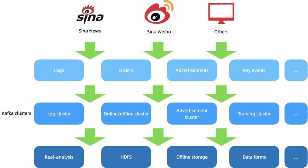 新浪现有 Kafka 集群主要处理来自新浪新闻、微博等的数据,数据类型包括特征日志、订单数据、广告曝光、埋点 / 监控 / 服务日志等。这些数据经过 Kafka 在线集群、广告专用集群、日志集群、离线集群和机器学习训练等集群的处理后,会用于推荐训练、HDFS 落地、离线数仓、实时监控、数据报表和实时分析等生产目的。