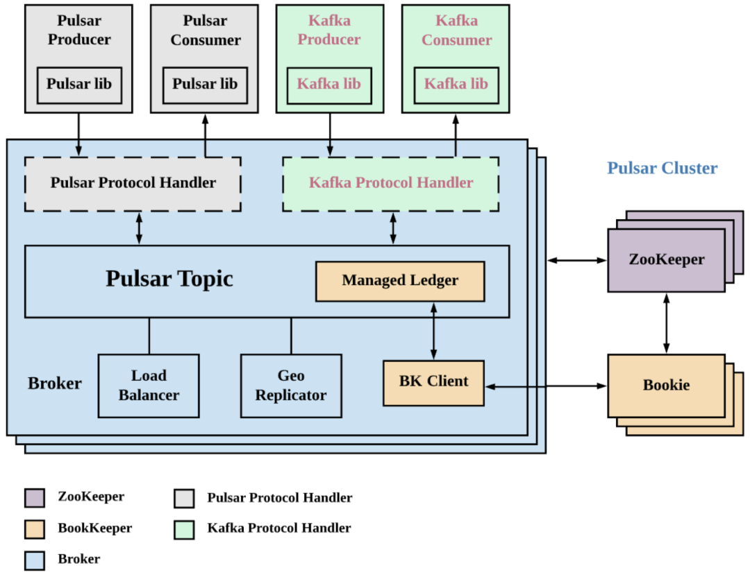 团队希望能有一个消息队列可以解决 Kafka 存在的这些问题,同时业务方只需简单修改配置,替换 Kafka 的 broker list 即可迁移。基于这样的背景,团队调研了存算分离架构的 Apache Pulsar,可以很好地解决上述挑战。Pulsar 的 bookie 和 broker 是分离的,而扩容时 bookie 可以自动承接新流量;broker 只承担一些元数据的计算工作,所以需要做 rebalance 时速度很快,无需数据移动。