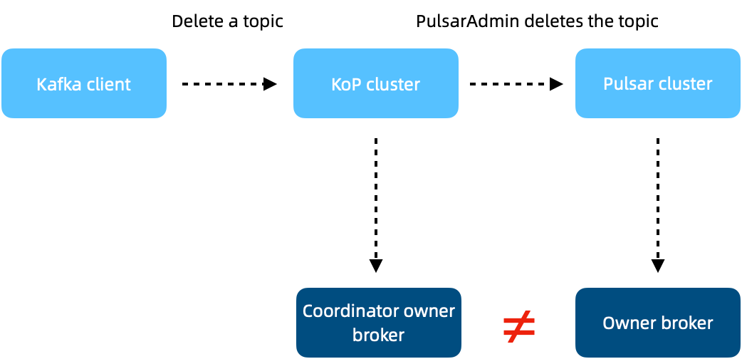 如上图,通过 KoP 消费 topic 时,消费的组元数据信息都会记到 coordinator 中,用 ./bin/kafka-consumer-groups.sh --bootstrap-server localhost:9092 --group my-group --describe可以看到描述的消费信息。当 topic 下线并删除时(./bin/kafka-topics.sh --bootstrap-server localhost:9092 —topic test —delete),再去描述组信息就会返回原数据超时异常。因为 admin 客户端执行删除命令时,请求到达 KoP Cluster,KoP broker 会通过 PulsarAdmin 删除 topic。Pulsar Cluster 处理删除请求时,会发送到所有分区的 owner broker 上,后者负责删除 topic 信息并移除 topic。