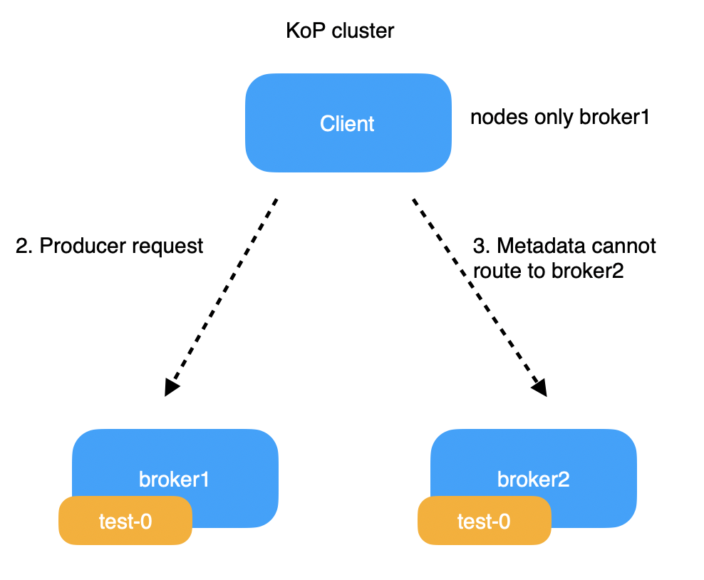 上图是一个两节点的 KoP 集群,客户端生产的 topic 的分区 0,位于 broker1 中。客户端的引导地址是 broker1 和 broker2。现在客户端要发送元数据请求给 broker2,broker2 会响应 metadata response。在 KoP 之前的处理逻辑中复用了 Topic lookup 机制,broker2 返回的 response 中不会包含自身的信息,只有分区所在的 broker1 的信息。然后客户端会向 broker1 分区的 leader 节点发送生产者请求。