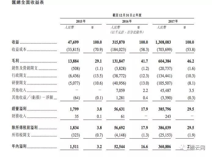 此外,嘉楠耘智2015年、2016年、2017年毛利分别为1388万元、1.32亿元、6.04亿元,毛利率分别为29.1%、41.7%、46.2%;运营利润分别为179.9万元、5663万元、3.858亿元,运营利润率分别为3.8%、17.9%、29.5%;年内利润分别为151.1万元、5254.4万元、3.6亿元,年内利润分别为3.2%、16.6%、27.6%。