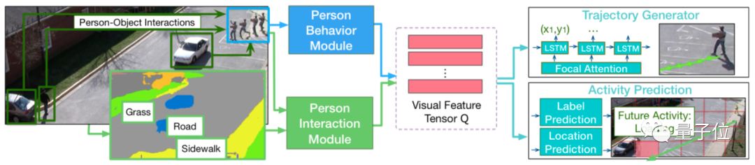 获得的信息交给LSTM编码器,压缩成一个“视觉特征张量”Q,交给剩下两部分生成轨迹和活动的预测结果。