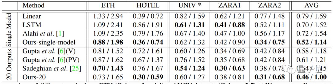 上图是各种算法在五个场景人物路径预测数据上的表现。