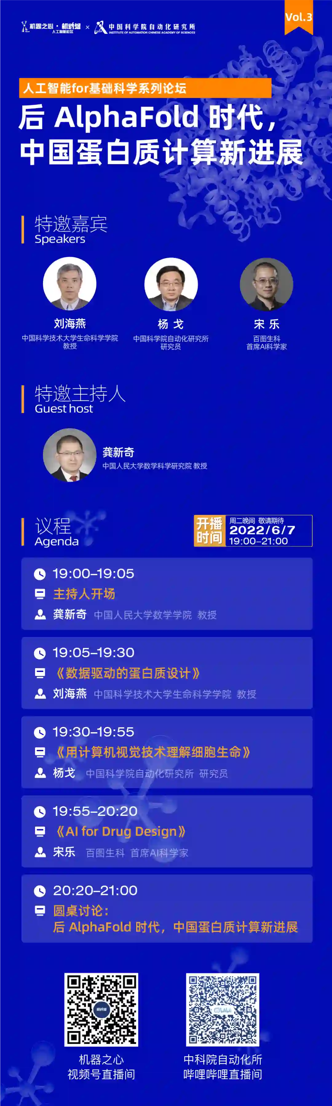 本次线上论坛以「后 AlphaFold 时代,中国蛋白质计算新进展」为主题,特邀中国人民大学数学科学研究院教授龚新奇主持,与多位领域专家共同分享交流,日程如下: