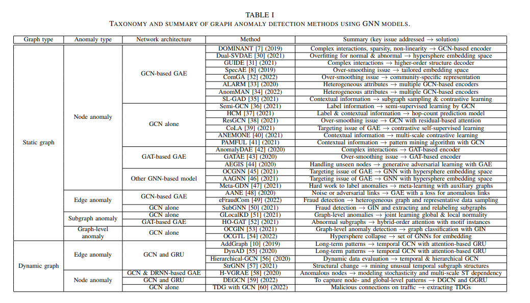 静态图异常检测的大部分研究都是针对节点异常,只有少数研究是针对边缘异常和子图异常。